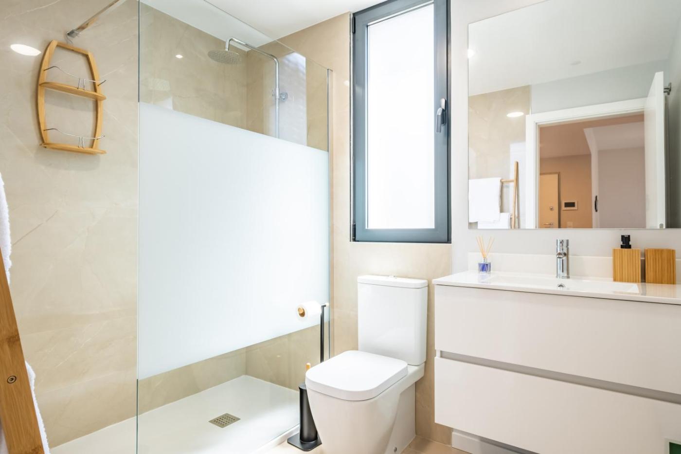 Two-Bedroom Apartment. Featuring a private entrance, this air-conditioned apartment consists of 1 living room, 2 separate bedrooms and 2 bathrooms with a walk-in shower and a bath. Guests can make meals in the kitchen that is equipped with a stovetop, a refrigerator, a dishwasher and kitchenware. The spacious apartment provides a flat-screen TV with cable channels, a washing machine, soundproof walls, a tea and coffee maker as well as sea views. The unit offers 4 beds.