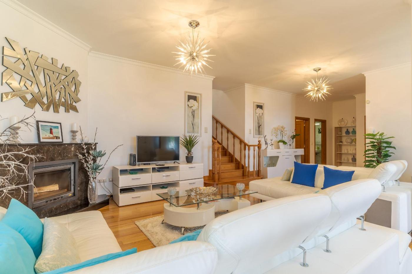 Three-Bedroom House. The pool with a view and fireplace are the standout features of this holiday home. This spacious holiday home features 1 living room, 3 separate bedrooms and 3 bathrooms with a bath and a shower. Guests will find a stovetop, a refrigerator, kitchenware and an oven in the fully equipped kitchen. The holiday home also comes with a barbecue. The holiday home features a washing machine, a private entrance, a tea and coffee maker, a flat-screen TV with cable channels, as well as sea views. The unit has 4 beds.